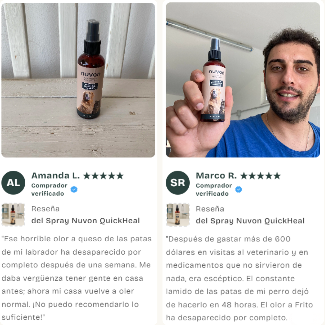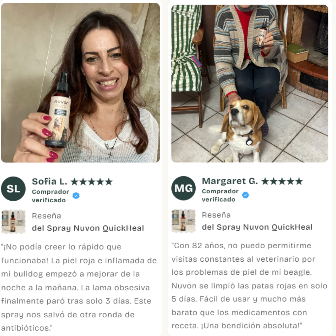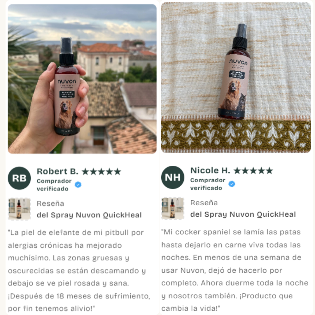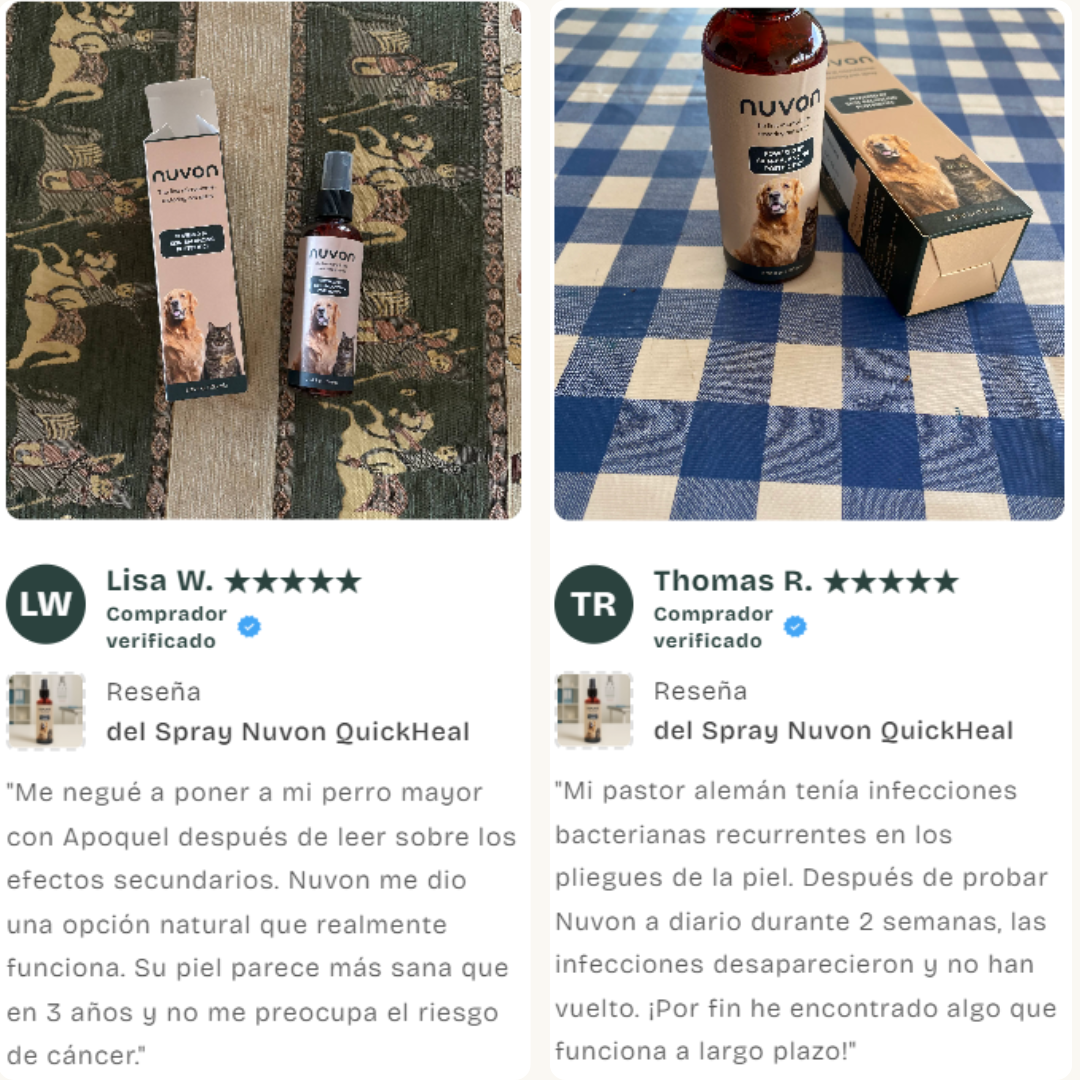 ¿El verdadero problema? El microbioma cutáneo de tu perro está destruido. Y hasta que no arregles eso, nada más funciona. El daño continúa. El olor vuelve. Las facturas se acumulan. Las pastillas tratan los síntomas. Nuvon trata la causa.